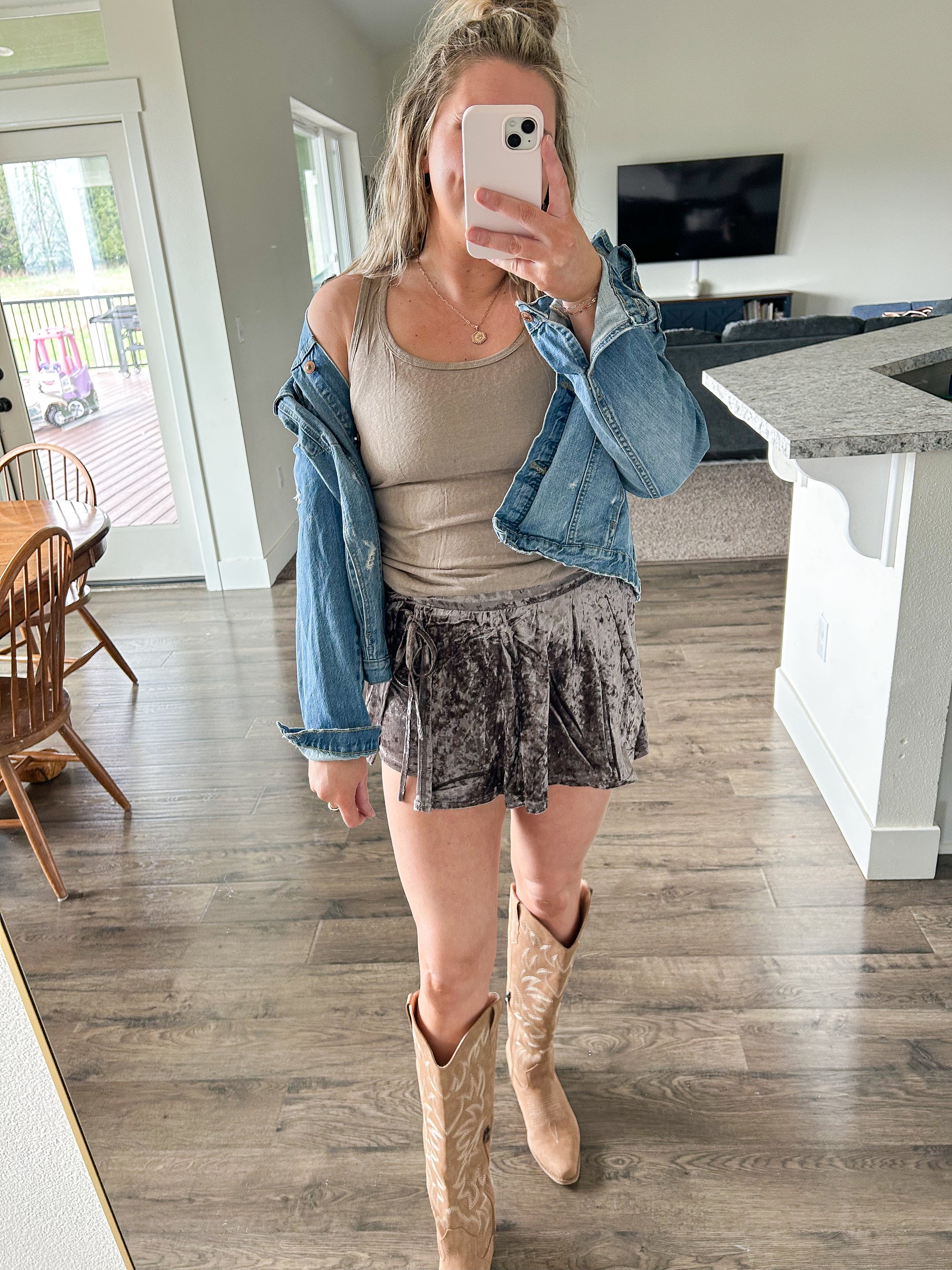 Get ready for some sassy summer fun with our Velvet Skort! Made with soft velvet, this skort is perfect for country concerts or date nights. The tie side adds a cute touch while offering versatility. So go ahead, be sassy and have some fun!